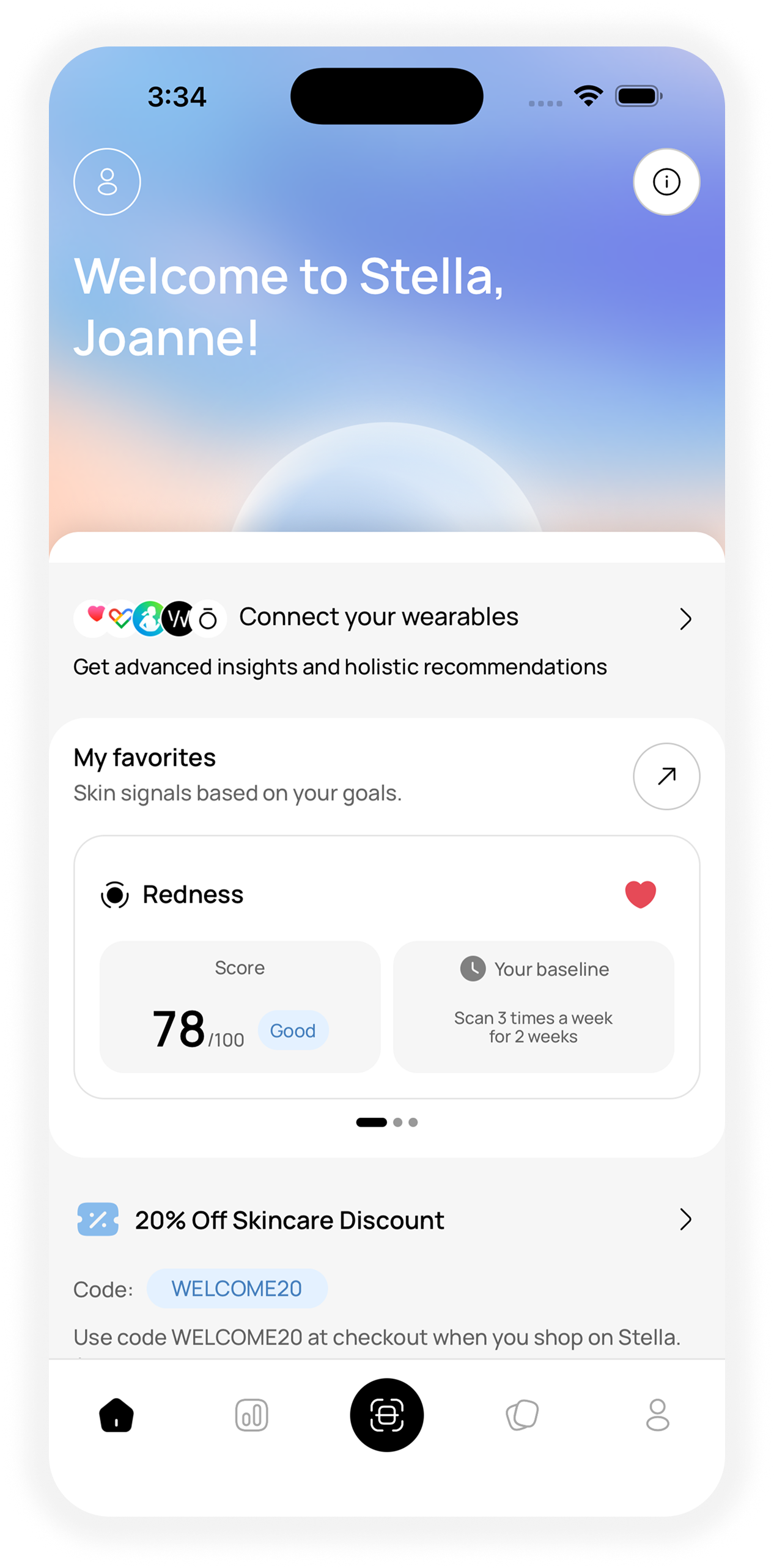 Stella reads what’s visible on your skin, learns your normal, and connects changes with your routine, habits and environment — so you can see what’s actually happening, and why.